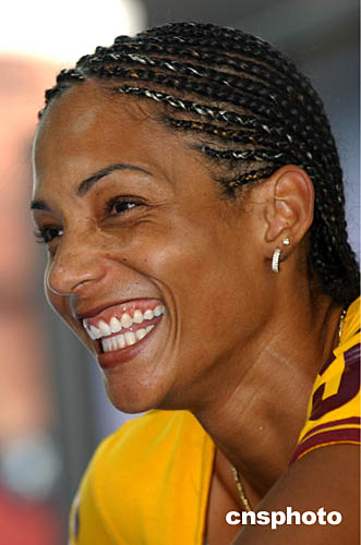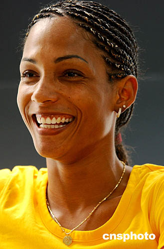 圖為法國賽跑選手Christine Arron在當(dāng)?shù)貢r間8月18日舉行新聞發(fā)布會時露出燦爛的笑容。她將在下周參加女子100米,200米和4*100米接力比賽。
