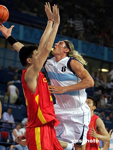 第二節(jié)開始,在阿根廷隊的全場緊逼戰(zhàn)術(shù)下,中國隊將第一節(jié)失誤的頻率進(jìn)一步加快,成全阿根廷隊打出了十七比二的高潮。至上半場結(jié)束,中國隊以二十一比四十一落后二十分。姚明僅僅得三分,五個籃板。