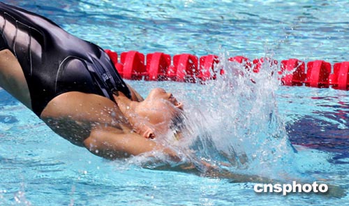 圖為當(dāng)?shù)貢r(shí)間8月19日女子兩百米仰泳比賽中德國選手Antje越入泳池的場景。