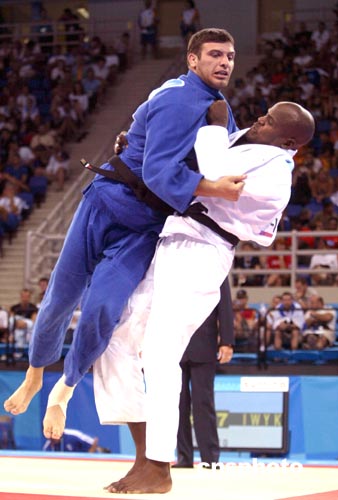 當(dāng)?shù)貢r(shí)間8月19日,希臘選手Vasileios與古巴選手Oreidis在男子100公斤級(jí)柔道賽場(chǎng)上一爭(zhēng)高下。