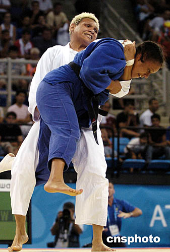 圖為在當(dāng)?shù)貢r間8月19日舉行的女子次重量級78公斤級柔道比賽中,巴西選手Edinanci Silva將法國選手Celine Lebrun“抱起”的情景。