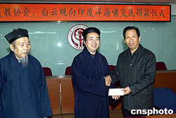 一月四日,中國道教協(xié)會(huì)、白云觀通過中華慈善總會(huì)向印度洋海嘯災(zāi)民捐款二十萬元人民幣。中新社記者:史利