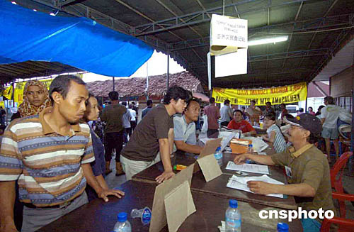 圖:班達(dá)亞齊災(zāi)民在棉蘭市收容所登記避難