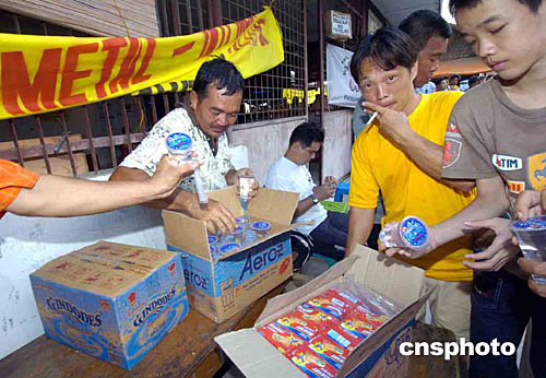 1月7日,在印度尼西亞棉蘭市的難民避難所內(nèi),遭受海嘯災(zāi)難影響的班達(dá)亞齊災(zāi)民分享華族團(tuán)體送來的賑災(zāi)食品。作者:洪少葵