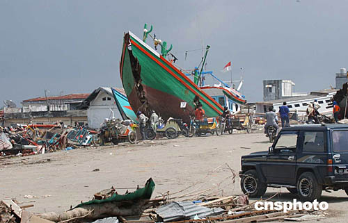 印度尼西亞海嘯災(zāi)難已歷經(jīng)十五日,1月9日,在班達(dá)亞齊伯納永區(qū)災(zāi)區(qū)最「壯觀」的景象應(yīng)屬船只被沖上岸。據(jù)當(dāng)?shù)厝私榻B,海岸離市區(qū)約有四、五公里遠(yuǎn),即是說,這些船被沖出了四、五公里遠(yuǎn),可見海嘯的沖擊力。