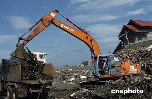 1月9日, 班達(dá)亞齊西部的洛阿村到市區(qū),清理廢墟的工作已經(jīng)加快。從洛阿村到市區(qū)的路上,一輛輛挖土機(jī)和鏟土機(jī)正在緊張地作業(yè),將破磚破木板以及雜物鏟到運(yùn)輸車上。據(jù)醫(yī)療部門(mén)人士說(shuō),災(zāi)難已經(jīng)過(guò)去十五日,如果不再及時(shí)清理死尸,很有可能爆發(fā)瘟疫。