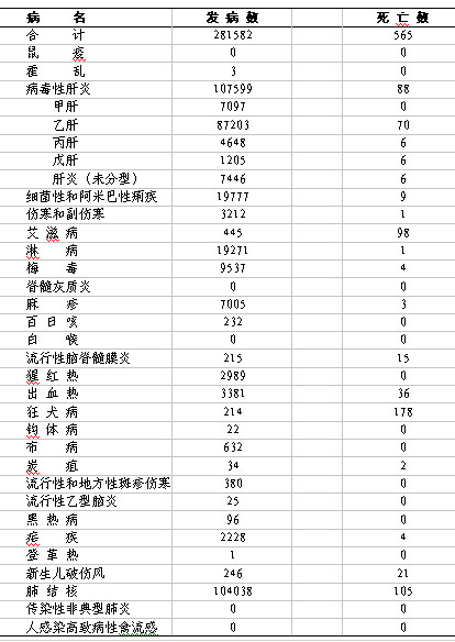 另外,死亡數(shù)居前五位的病種為:狂犬病、肺結(jié)核、艾滋病、乙型肝炎、流行性出血熱,占死亡總數(shù)的86.19%。