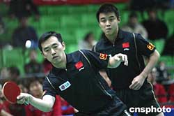 圖為中國乒乓球隊(duì)員孔令輝、王浩在義賽比賽中。作者:盛佳鵬