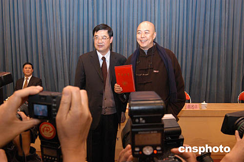“皇阿瑪”——張鐵林十七日正式受聘出任籌建中的暨南大學藝術(shù)學院院長、教授。張鐵林因在《還珠格格》等影視劇中的出色表演而紅遍海內(nèi)外。圖為暨南大學校長劉仁懷為張鐵林頒發(fā)聘任書。作者:劉衛(wèi)勇