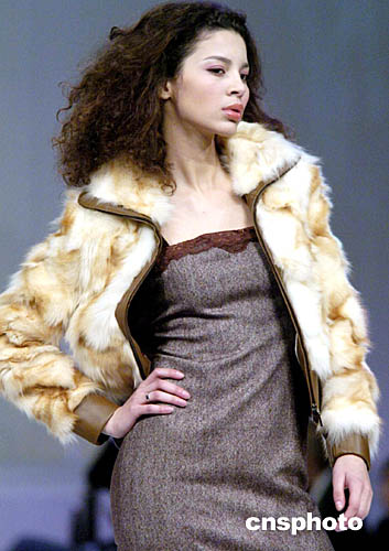 1月19日,香港會(huì)展中心舉行的“香港時(shí)裝節(jié)秋冬系列2005”上,模特展示“獨(dú)家時(shí)裝表演”專(zhuān)場(chǎng)皮草秋冬系列。作者: 洪少葵