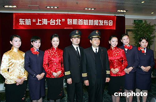 | 一月十九日,東航“上海—臺北”包機(jī)飛行的機(jī)組人員在上海正式亮相。身著繡滿中國傳統(tǒng)“雙飛蝶”圖案唐裝的東航空姐,將在該包機(jī)航班上提供空中服務(wù)。屆時(shí),上海浦東國際機(jī)場的值機(jī)區(qū)域、頭等艙休息室、VIP和頭等公務(wù)專車等處,安排著唐裝的地面服務(wù)人員也將為旅客提供咨詢引導(dǎo)等服務(wù)。富于濃郁臺灣風(fēng)味的“佳肴”也將出現(xiàn)在航班上。作者:潘索菲