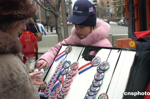 當(dāng)?shù)貢r(shí)間1月20日,在布什就職典禮會(huì)場外,小商販兜售帶有布什頭像的紀(jì)念章,頗為搶手。作者:余東暉