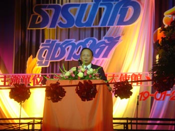 張大使在致辭中表示,泰國政府和人民面對突如其來的海嘯災(zāi)難,反應(yīng)迅速,措施有力,在很短的時間內(nèi)取得了階段性成果。中國政府和人民對泰國遭災(zāi)十分關(guān)注。胡錦濤主席和溫家寶總理致電慰問,中國政府派出醫(yī)療隊和DNA專家組協(xié)助救災(zāi)。中國國內(nèi)各界群眾、海外華人華僑、中資機(jī)構(gòu)和留學(xué)生掀起了一波波捐款熱潮!耙环接须y,八方支援”,這一中華民族的優(yōu)良傳統(tǒng)發(fā)揚(yáng)光大到了一個新的高度。