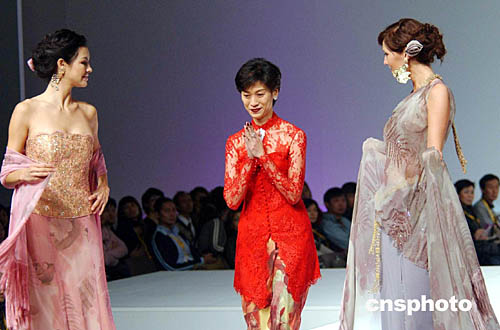1月21日,在“香港時裝節(jié)秋冬系列”及“香港國際時尚薈萃”上,舉辦第二場“國際時裝設(shè)計師表演”,圖為印度尼西亞時裝設(shè)計師Susie Hedijanto與模特登臺謝幕。作者:洪少葵