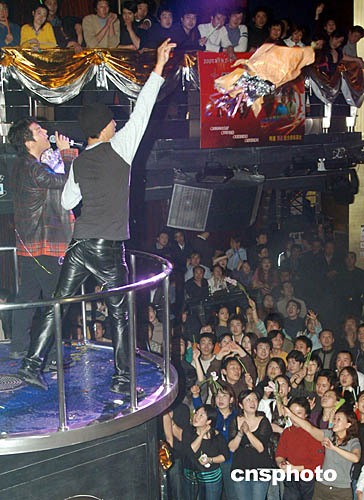 一月二十一日晚,著名演唱組合“羽泉”在北京一家新開業(yè)的DISCO演唱歌曲,令現(xiàn)場(chǎng)的觀眾興奮不已。作者:張宇