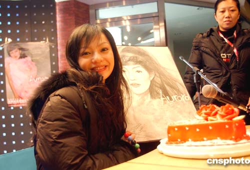 人氣急升的臺(tái)灣歌壇女新人張韶涵一月二十三日在北京舉辦歌迷見面會(huì),簽售新專輯《歐若拉》。圖為張韶涵展示歌迷送上的慶功蛋糕和畫像。作者:韓藝冰