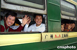 春運(yùn)拉開(kāi)帷幕,在廣東中山市打工的外來(lái)人員愉快登上廣州開(kāi)往上海的三五○次春運(yùn)臨時(shí)客車。今年廣州鐵路集團(tuán)春運(yùn)期間將安排一百四十二對(duì)臨客列車,接送返鄉(xiāng)過(guò)年旅客。作者:丁勇