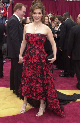 身著阿瑪尼時(shí)裝的勞拉·哈林(Laura Harring)出席在第74屆奧斯卡頒獎(jiǎng)禮上。當(dāng)時(shí)她展示一對(duì)價(jià)值上百萬美元的白金鉆石孔錐形高跟鞋。這雙鞋子由設(shè)計(jì)師斯圖亞特·威特門和白金協(xié)會(huì)共同完成。哈林還戴了一條價(jià)值兩千七百萬元的項(xiàng)鏈。