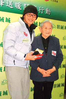 中新網(wǎng)1月27日電 據(jù)大公報(bào)報(bào)道,謝霆鋒昨日到救世軍出席“送暖關(guān)懷行動”,向長者送羽絨。期間有位婆婆被感動得落淚,霆鋒即時(shí)上前安慰,也有婆婆大贊霆鋒有爸爸謝賢的俊朗,又贊其有善心,祝他長命百歲,場面溫馨。