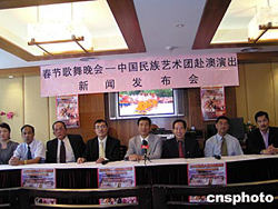 | 以西藏藝術(shù)家為主的中國民族藝術(shù)團,將于2005年春節(jié)期間赴澳大利亞巡回演出,為當?shù)厝A人華僑歡度春節(jié)增添喜慶氣氛。澳中文化科技促進會會長馮敦平博士(左4)當?shù)貢r間1月27日在悉尼華埠舉行的新聞發(fā)布會上說,中國民族藝術(shù)團赴澳巡演首場于2月11日(大年初三)在悉尼市政廳舉行。中國駐悉尼總領(lǐng)事館文化領(lǐng)事尹亞利(右4)說,這一被中國文化部譽為“國家杰出文化團體”,此后將赴堪培拉參加澳大利亞多元文化藝術(shù)節(jié),并到阿德萊德、墨爾本、黃金海岸和布里斯班等地巡演。作者:劉雨生