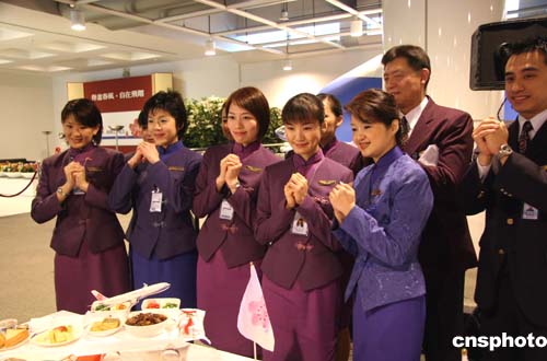 在身著深紫和深藍(lán)套裝的空中小姐中,穿一身筆挺西裝的“空中先生”孫建豪格外醒目。他介紹,“華航”擁有空中服務(wù)人員五千多位,其中男性有一千多位。所以,剛剛走出校園才從業(yè)一年的他,五天前得知將飛首航,心情非常激動(dòng)。他說(shuō),我平時(shí)就喜歡了解大陸的習(xí)俗風(fēng)情,父母也都去那邊旅游。此次是第一次去大陸、去北京,十分希望在短暫的地停時(shí)間抽空出去四處看看。