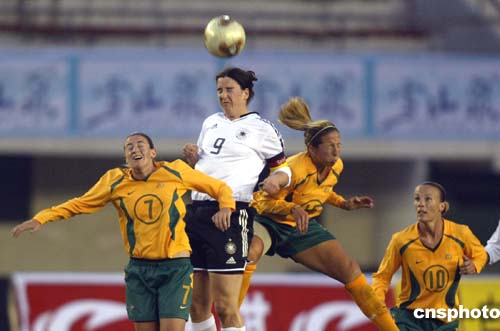 一月二十八日晚,二零零五年四國女足錦標(biāo)賽在福建泉州進(jìn)行首場比賽,澳大利亞隊(duì)以一比零的比分戰(zhàn)勝奧運(yùn)會(huì)和世界杯雙料冠軍德國隊(duì)。圖為德國隊(duì)九號(hào)普林茨與澳大利亞隊(duì)員爭頭球。作者:盛佳鵬