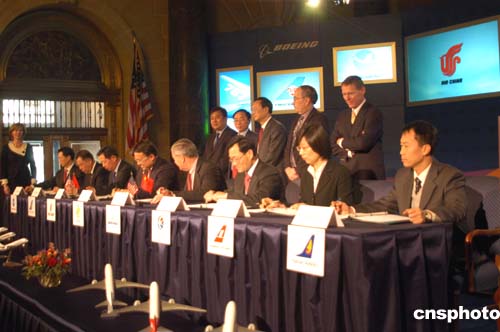 根據(jù)雙方當(dāng)天在美國商務(wù)部簽署的框架協(xié)議,中國國航、東航、南航、海南航空、廈門航空、上海航空將從波音公司訂購六十架波音七E七飛機(jī),按照平均目錄價格計(jì)算,此協(xié)議總價值七十二億美元。這批飛機(jī)將從二00八年開始陸續(xù)交付使用。