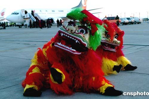 中國(guó)國(guó)際航空公司的CA1087/8航班一月二十九日上午七時(shí)四十六分從北京首都國(guó)際機(jī)場(chǎng)出發(fā)飛往臺(tái)北,這是五十六年來(lái)大陸民航班機(jī)首度飛往臺(tái)灣。圖為首航儀式上的舞獅表演。作者:滿會(huì)喬