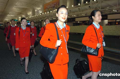 一月二十九日晨,南航廈航臺(tái)商春節(jié)包機(jī)首航儀式在廣州白云國(guó)際機(jī)場(chǎng)舉行。南航的CZ3097航班和廈航的MF881航班分別于八時(shí)、八時(shí)十五分滿載臺(tái)商從廣州飛往臺(tái)北,南航CZ3097航班也成為五十六年來(lái)首架降落在臺(tái)灣的祖國(guó)大陸民航客機(jī)。圖為南航空姐靚裝上崗。作者:陳文