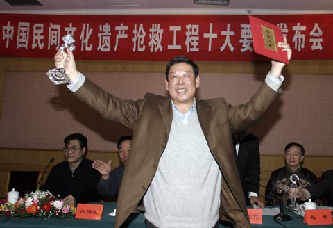 為了推動該工程的順利實施、擴大該工程的影響力,中國民間文藝家協(xié)會最近組織新聞出版界、文藝界、教育界、學(xué)術(shù)界專家及民間文化專家共同評選出了“2003至2004年度中國民間文化遺產(chǎn)搶救工程十大新聞”。這十大新聞包括:河南省全面實施民間文化遺產(chǎn)搶救工程、民俗影像專家樊宇民間文化遺產(chǎn)影像記錄40萬里行、《中國木板年畫·楊家埠卷》示范本問世、《中國民俗志叢書·北京門頭溝卷》普查完成、西部民歌搶救行動傳捷報、薩滿文化保護體系初建成、首屆搶救保護和開發(fā)民間文化遺產(chǎn)縣長論壇、河北民協(xié)搶救武強年畫古雕版、臺灣藝員趙文瑄捐資百萬支持民間文化遺產(chǎn)搶救和CCTV舉辦西部民歌電視大賽等。