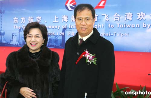 一月二十九日上午八點(diǎn),上海航空首飛臺(tái)灣歡送儀式在浦東國(guó)際機(jī)場(chǎng)舉行,國(guó)民黨籍代表江綺雯出席儀式并與上海臺(tái)灣同胞投資企業(yè)協(xié)會(huì)會(huì)長(zhǎng)葉惠德合影。作者:湯彥俊