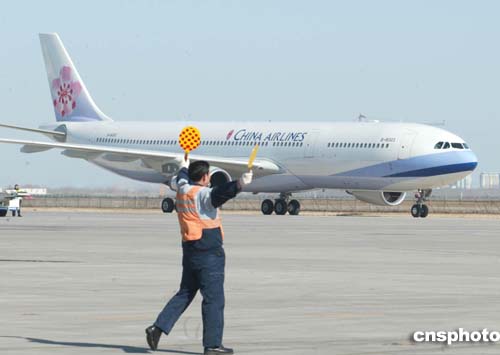 臺(tái)灣中華航空公司的民航班機(jī)一月二十九日十一時(shí)五十八分飛抵北京首都國際機(jī)場(chǎng),這是五十六年來臺(tái)灣民航航班首度飛抵北京。作者:滿會(huì)喬