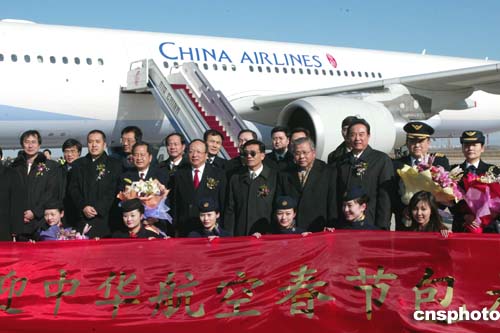 國臺(tái)辦主任陳云林、副主任李炳才、國家民航總局局長(zhǎng)楊元元、北京市副市長(zhǎng)張茅、臺(tái)灣國民黨籍民意代表章孝嚴(yán)等到機(jī)場(chǎng)迎接并與機(jī)組人員合影。作者:滿會(huì)喬