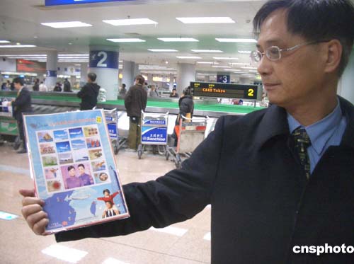 二00五年臺商春節(jié)包機二十九日首次實現(xiàn)兩岸雙向對飛,臺灣首班飛抵北京的華航CI581班機于十一點五十八分到達北京首都機場,華航為此特發(fā)行紀念郵票一套,并在飛機上贈送給旅客。作者:路梅