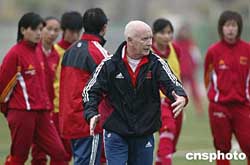 一月二十九日,中國女足在泉州對陣對陣德國隊前進行訓(xùn)練。圖為中國女足技術(shù)顧問基斯·布倫特向女足隊員講解戰(zhàn)術(shù)。作者:盛佳鵬