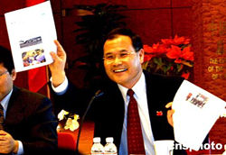 圖為中國(guó)駐紐約總領(lǐng)事劉碧偉舉著自己從網(wǎng)站上打印下來(lái)的有關(guān)兩岸春節(jié)包機(jī)首航成功的報(bào)道和紐約華人一起分享喜悅。