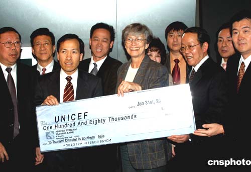 當(dāng)?shù)貢r(shí)間一月三十一日,美東華人社團(tuán)聯(lián)合總會(huì)和華人社團(tuán)聯(lián)席會(huì)向聯(lián)合國(guó)兒童基金會(huì)捐贈(zèng)了十八萬美元,用于救助東南亞海嘯災(zāi)民。聯(lián)合國(guó)兒童基金會(huì)執(zhí)行主任卡羅·貝拉米女士(中)代表聯(lián)合國(guó)兒童基金會(huì)接受捐款。作者:趙海燕
