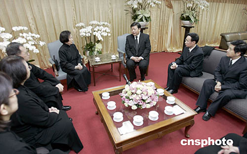 孫亞夫、李亞飛今天下午抵達(dá)臺北,四點三十五分前往靈堂吊唁辜振甫先生。圖為吊唁后與其家人座談。(臺灣海基會故董事長辜振甫先生治喪工作小組提供)中新社記者:邢利宇