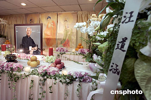 孫亞夫、李亞飛今天下午作為汪道涵先生的個(gè)人代表抵達(dá)臺(tái)北來靈堂吊唁辜振甫先生。圖中辜先生靈堂擺設(shè)有汪道涵先生贈(zèng)送的花籃。(臺(tái)灣海基會(huì)故董事長(zhǎng)辜振甫先生治喪工作小組提供)中新社記者:邢利宇