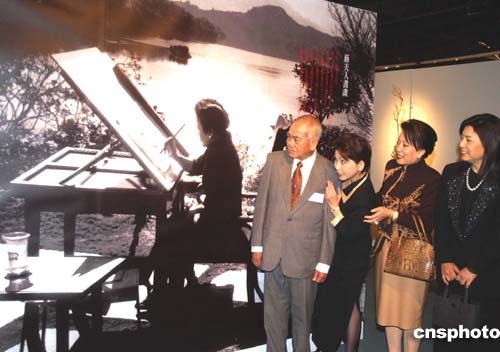 “世紀(jì)蔣宋美齡文物展”二月一日在美國(guó)洛杉磯開幕。宋美齡孫媳蔣方智怡(右一)、宋家代表宋曹琍璇(右二)與《世界日?qǐng)?bào)》社長(zhǎng)蘇民生夫婦一起,觀賞宋美齡創(chuàng)作國(guó)畫的巨幅照片。作者:賈國(guó)榮