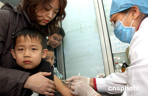 二月二日,北京市疾病控制中心醫(yī)務(wù)人員為一名兒童接種流腦“A+C”疫苗。北京近日從蘭州緊急調(diào)運(yùn)了十萬(wàn)份疫苗,今天下午已開(kāi)始市民進(jìn)行接種。截止到目前,北京至今未發(fā)現(xiàn)C群流腦疫情。作者:韓藝冰