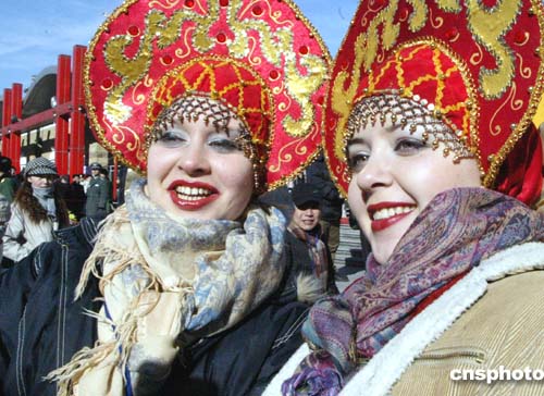 二零零五北京朝陽國際風(fēng)情節(jié)二月九日(正月初一)在北京朝陽公園開幕,連續(xù)七天的國際風(fēng)情節(jié),將為京城市民及中外游客上演豐富多彩的異國風(fēng)情文化及中西美食。圖為來自俄羅斯風(fēng)情舞蹈團(tuán)的姑娘興高采烈游園觀光。作者:錢興強(qiáng)