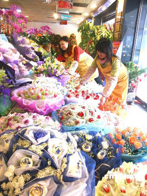 2月14日是“情人節(jié)”,南京各大花店準(zhǔn)備制作的百合、玫瑰、郁金香等各種手捧鮮花,已擺滿了店堂,供情侶們前來挑選。圖為太平北路一家花店的員工在忙著擺放剛制作的手捧鮮花。作者:谷昌旺