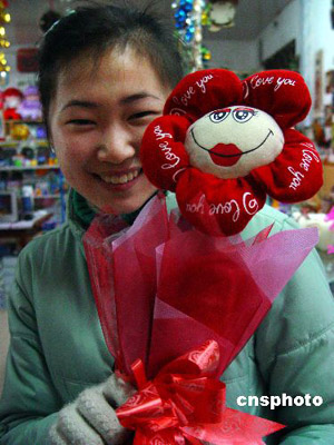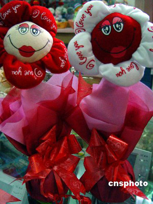 2月13日,在仙居縣一禮品商場,女青年在挑選“會說話”的“電動玫瑰”。這種用布娃造型的玫瑰,內(nèi)安裝了馬達(dá)和發(fā)聲器,輕搖“玫瑰”會發(fā)出“我愛你”之類的聲響。“情人節(jié)”前夕,商家挖空心思、別出心裁推出“會說話”的電動玫瑰,深受青年朋友喜愛。作者:華文武
