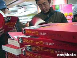 美國人羅伯特.勞倫斯.庫恩博士所著的《他改變了中國:江澤民傳》,春節(jié)之前一面市便受到廣大書友的追捧。圖為2月17日北京西單圖書大廈內幾位讀者正在聚精會神地看書。作者:納夢月