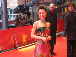 張靜初在《孔雀》首映,以一襲中式繡片禮服現(xiàn)身,她身上的繡片有上百年的歷史,十分迷人。柏林天寒地凍,張靜初以無袖禮服和柏林影展主席狄亞特柯斯利克又戴幅又穿厚大衣,形成紅地毯上的有趣對比。