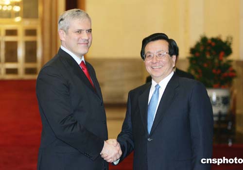 中國(guó)國(guó)家副主席曾慶紅二月二十二日在北京人民大會(huì)堂與來(lái)訪的塞黑塞爾維亞共和國(guó)總統(tǒng)塔迪奇舉行會(huì)談。作者:毛建軍
