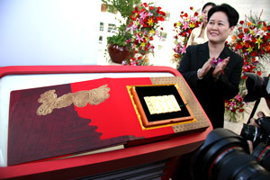 中國銀行股份有限公司今日還代表發(fā)行方和經(jīng)銷方將本次發(fā)行的具有特殊意義的二十九號一百克的“北京奧運金”捐贈給了第二十九屆奧林匹克運動會組織委員會作永久保留,表達社會各界對北京二00八年奧運會的祝福和期盼。