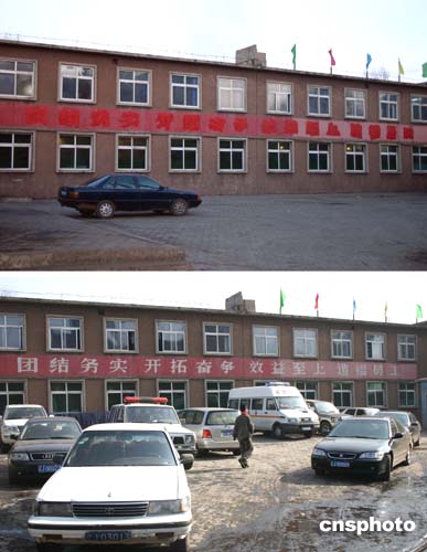 | 發(fā)生特大礦難的遼寧阜新孫家灣煤礦礦區(qū)的大幅標(biāo)語日前被涂抹遮蓋。上圖顯示“效益至上”的標(biāo)語被涂抹遮蓋;下圖顯示“效益至上”標(biāo)語未被涂抹前十分醒目。二月十四日發(fā)生的孫家灣煤礦特大礦難,已知造成二百一十四名礦工死亡,是四十多年來中國煤礦礦難事故死亡人數(shù)最多的一次。作者:中新社