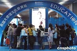 第十屆中國國際教育巡回展二月二十六日在北京開幕。眾多北京高校大學生在展臺前咨詢留學英國事宜。來自英國、法國、荷蘭香港等二十七個國家和地區(qū)的三百多所高校和教育機構組團參加了本次展覽。作者:鄒憲